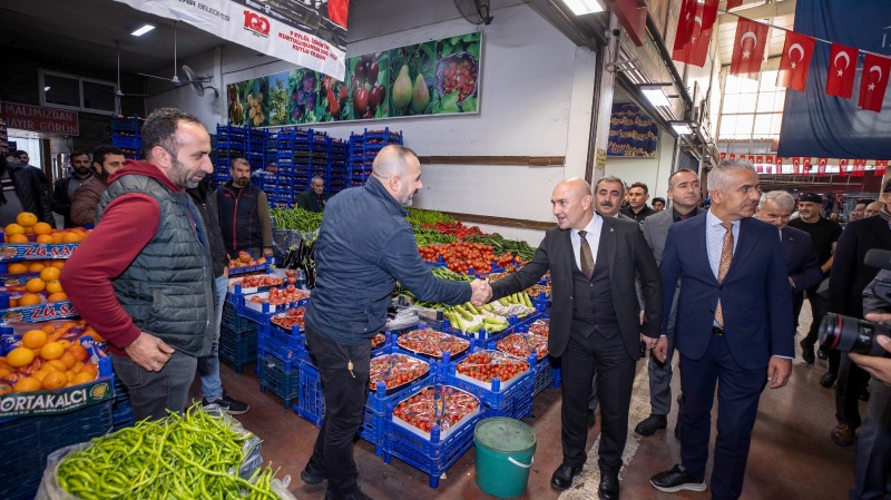 Etkinlik öncesi hal esnafını ziyaret eden Başkan Tunç Soyer, konuşmasında Türkiye’deki tarım politikalarından söz ederek “Türkiye, daha 50-60 yıl öncesine kadar, kendi kendine yetebilen, dahası etrafındaki ülkeleri de doyurabilen bir tarım ülkesi, bir tahıl ambarı oldu. Benim yaşlarımda olan herkesin, özellikle de yerli malı haftasında öğretmenlerinden duyduğu bu sözler, yazık ki artık geçmişte kaldı. Bir de Hakkâri’den Edirne’ye her ilin bitkisel ve hayvansal ürünlerinin yer aldığı bir Türkiye Haritası vardı. O da kayboldu. 50-60 sene içinde çok şey kaybettik. Ülkemizi postallarla işgal edemeyenler, zehirli tohumlarıyla ve kimyasallarıyla işgal ettiler. En büyük darbe, hiç kuşkusuz bir gecede 16 bin köyün kapatılması ile gerçekleşti. Tarım geleneğini sürdüren aile çiftçiliği, büyük şirketlere kurban edildi. Bereketli topraklarımız ve meralarımız yavaş yavaş yok edildi. Düşünün, anavatanı Anadolu olan buğdayı, bir zamanlar ambarı olduğumuz tahıl ürünlerini üretmek yerine dışarıdan ithal eder konuma geldik. Bu bizim için çok acı bir tablo” ifadelerini kullandı.