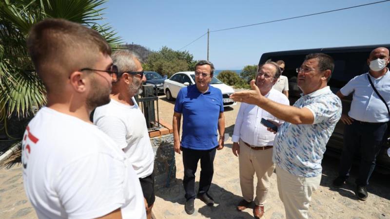 Kıyı Ege Belediyeler Birliği Başkanı Abdül Batur, Birliğin yönetim kurulu üyeleriyle birlikte yangın bölgesini ziyaret ederek incelemelerde bulundu.