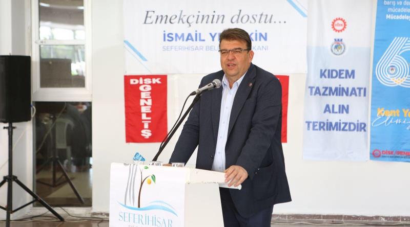Türkiye Devrimci İşçi Sendikaları Konfederasyonu (DİSK) Ege Bölge Temsilcisi Memiş Sarı da sözlerine emekçiyi hiçbir zaman yalnız bırakmayan Seferihisar Belediye Başkanı İsmail Yetişkin’e teşekkür ederek sözlerine başlarken “Bu ülkenin doğasını talan eden iktidara karşı bir bildiri bile dağıtmayan bir sendikanız varsa yanında durmayın. Kadın cinayetlerini, iş cinayetlerini görmezden gelen kadınlara değer vermeyen bir sendikanız varsa istifa edin. Geleceğinizi karartacak olanlara oy vermeyin. Eğer emekten yana emekçinin hakkını veren bir belediye başkanınız varsa onunla yürüyün. Buradan tüm işçi kardeşlerime toplu iş sözleşmelerinin hayırlı uğurlu olmasını diliyorum.” dedi.