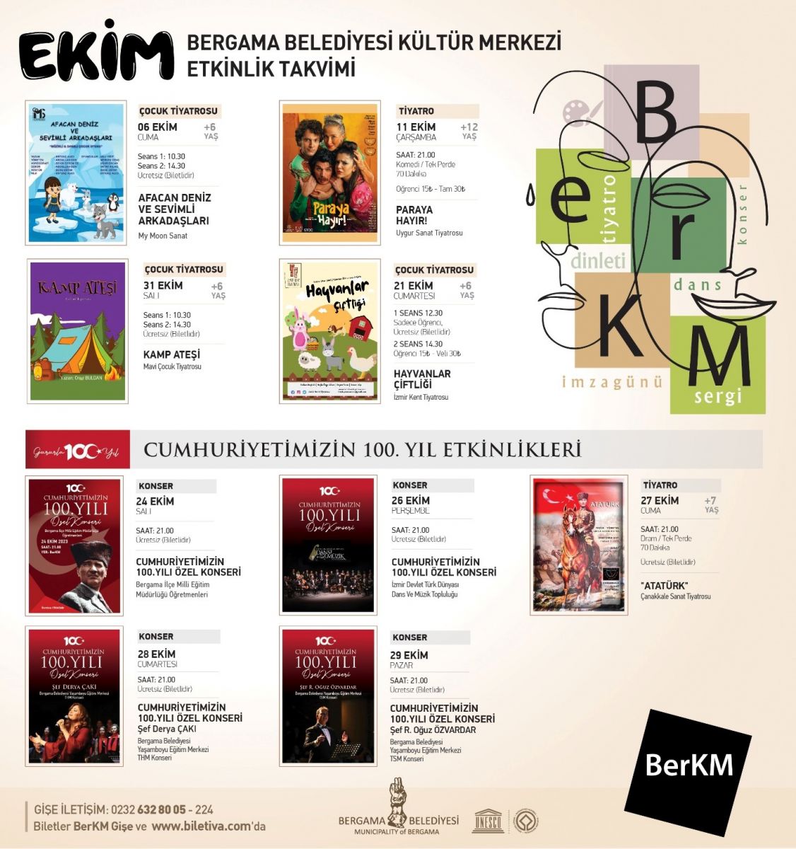 Cumhuriyetimizin 100. Yılına özel etkinliklerin de düzenleneceği BerKM’de konser ve tiyatro gösterileri de yapılacak. Cumhuriyetimizin 100. Yılı Özel Konser serisinde 24 Ekim saat 21.00’de Bergama İlçe Milli Eğitim Müdürlüğü Öğretmenleri, 26 Ekim saat 21.00’de İzmir Devlet Türk Dünyası Dans ve Müzik Topluluğu sahne alacak. 28 Ekim saat 21.00’de Şef Derya Çakı’nın yönetiminde Bergama Belediyesi Yaşamboyu Eğitim Merkezi Türk Halk Müziği konseri, 29 Ekim saat 21.00’de Şef R. Oğuz Özvardar yönetiminde Yaşamboyu Eğitim Merkezi Türk Sanat Müziği konseri verilecek. 27 Ekim saat 21.00’de Çanakkale Sanat Tiyatrosunun “Atatürk” konulu gösterisi sahne alacak.