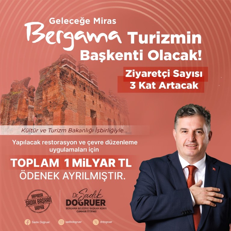 Bergama’nın ulusal ve uluslararası alanda hak ettiği yeri almasını sağlayacaklarını belirten Mehmet Nuri Ersoy, Bergama için 1 milyar TL kaynak öngörüldüğünü belirtti. Yıllık ortalama 500 bin civarında turistin geldiği Bergama’ya yatırımların yapılmasıyla 1.5 milyonun üzerinde turist kapasitesine çıkaracaklarını açıkladı.