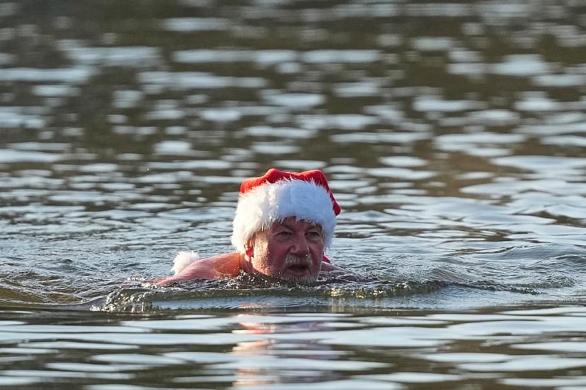 Cesur kış yüzücüleri, Noel Günü, Berlin’deki Oranke Gölü’nde neşeyi soğuğa meydan okuyan bir kararlılıkla buluşturan bir tatil geleneği için bir araya geldi. Noel Baba şapkaları ve şenlikli kostümler giyen grup, izleyiciler donmuş kıyıdan seyrederken birlikte suya doğru yürüdü.