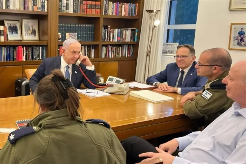 Basın ofisinden paylaşılan fotoğrafta, Netanyahu'nun İsrail Ulusal Güvenlik Konseyi Başkanı Tzachi Hanegbi, askeri danışmanı Roman Gofman ve bazı yetkililerle toplantı halinde olduğu görülüyor. Herhangi bir açıklama yapılmadan paylaşılan fotoğrafta, İsrail Başbakanı Netanyahu'nun kırmızı kablolu sabit telefonla konuştuğu fotoğrafta göze çarpıyor.