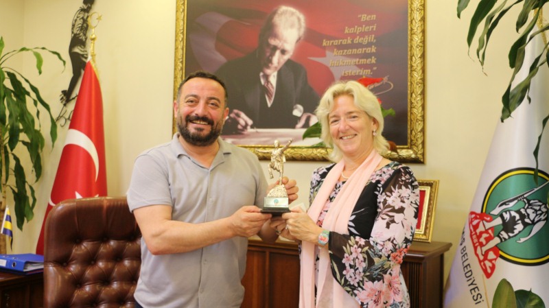 SENTRUM Projesi’nin açılışı için Ödemiş’e gelen Birleşmiş Milletler Temsilcisi Louisa Vinton, Belediye Başkanı Mustafa Turan’ı makamında ziyaret etti.