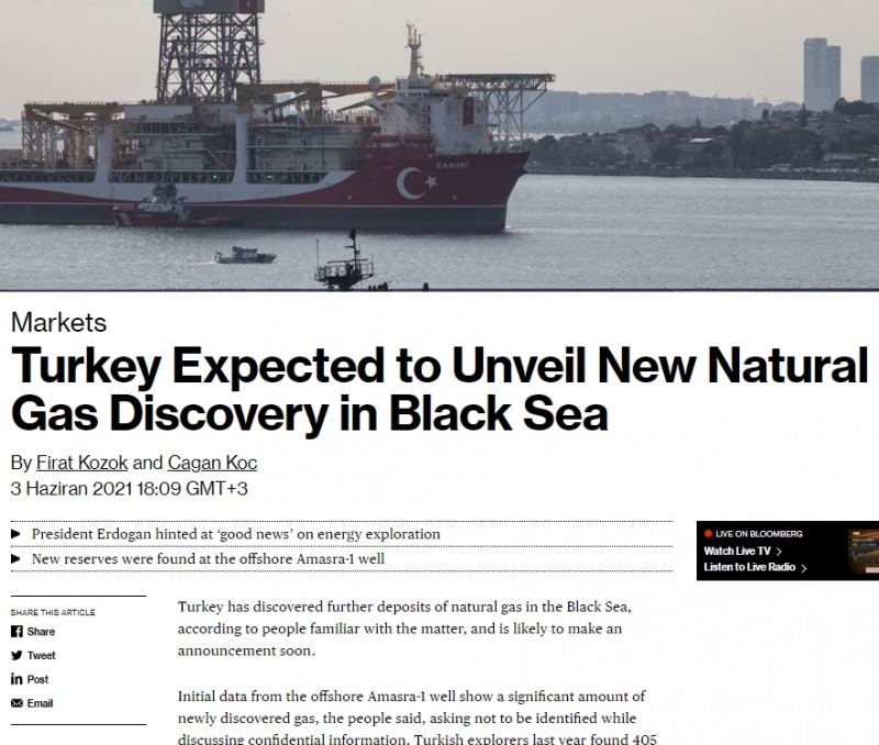 Bloomberg, Türkiye'nin Karadeniz’de yeni bir doğalgaz rezervi daha tespit ettiğini yazdı.Cumhurbaşkanı Recep Tayyip Erdoğan'ın petrol ve doğal gaz arama çalışmaları konusunda "Cuma günü Zonguldak'ta bir müjde açıklayacağız" sözleri üzerine müjdenin ayrıntılarına ilişkin ABD basınından dikkat çeken bir iddia geldi. Bloomberg gazetesine konuşan kaynaklar, Türkiye'nin Karadeniz'deki Amasra-1 kuyusunda önemli miktarda yeni doğal gaz keşfettiğini söyledi.