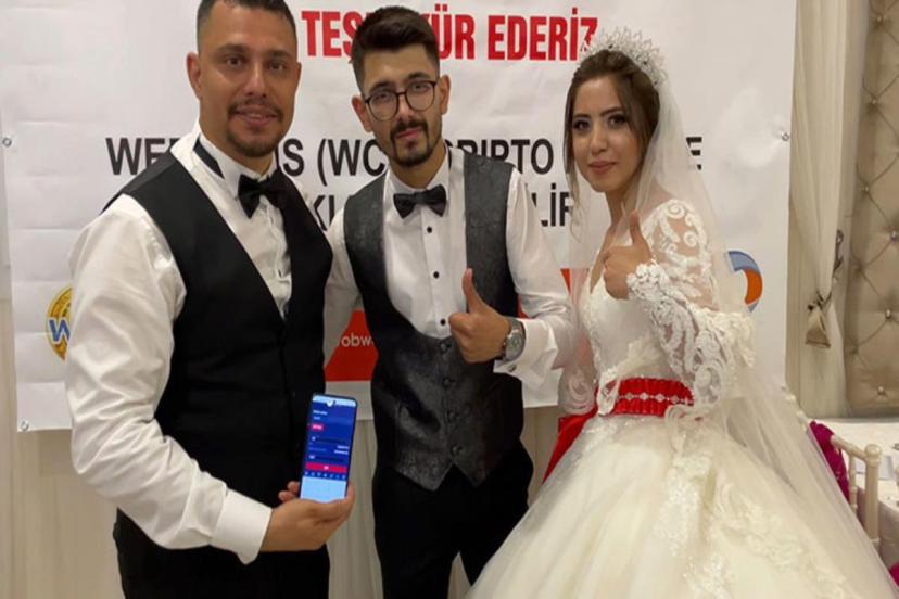 Damat tarafının aile yakını olarak düğüne katılan kripto para yatırımcısı Hamza Özkan Cıbır, "Belki de geleceğin olayını yapıyoruz şu anda, kripto paralar ile gelinle damada takılar takıyoruz. Artık her şey dijitalleşiyor. Düğünlerde bile takılar bu şekilde yapılabiliyor" dedi. 3 bin dolar değerinde kripto para takılan gelin ve damat ise kameralara bol bol poz verdiler.