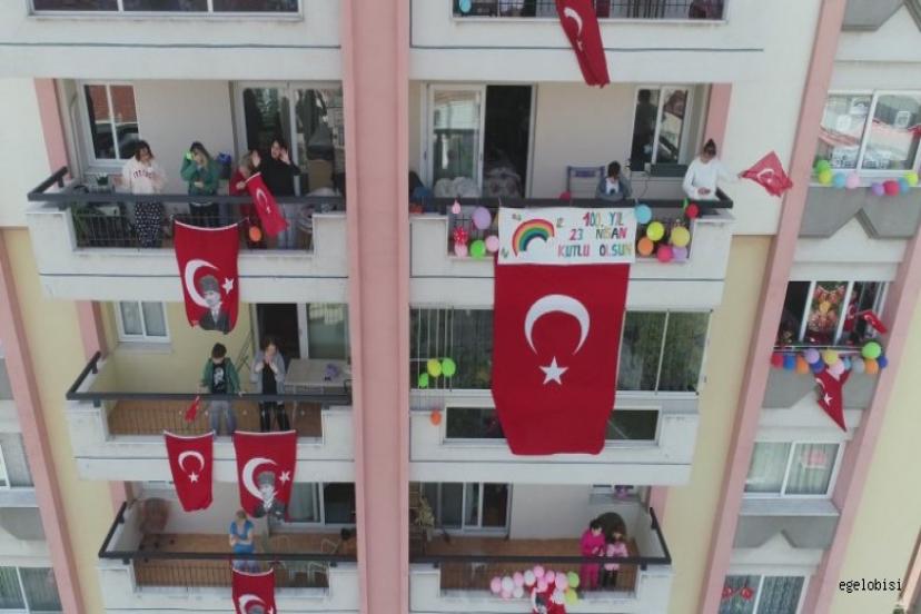 Koronavirüs salgını nedeniyle bu yıl alanlarda kutlanamayan 23 Nisan Ulusal Egemenlik ve Çocuk Bayramı’nın 100’üncü yıl coşkusu, Buca’da evlere sığmadı. Buca Belediyesi tarafından hazırlanan bandolu 23 Nisan korteji, gün boyu kent sokaklarındaki coşkuya ortak oldu. Miniklerin evlerinin balkonlarından ellerinde bayraklarıyla, şarkılarla eşlik ettiği kortej, drone ile hemşehrilere bayrak dağıttı.