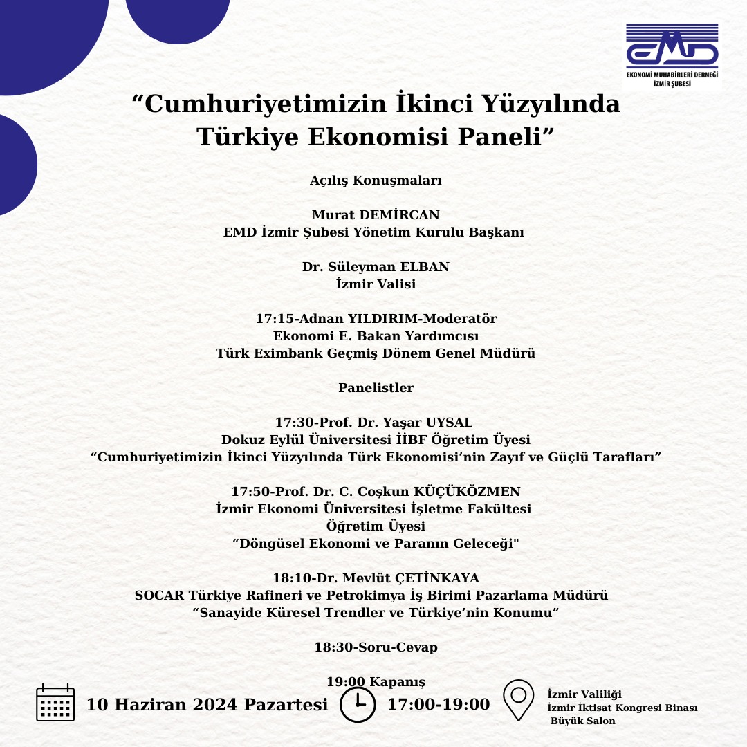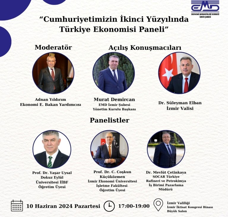 10 Haziran 2024 Pazartesi bugün saat:17:00’de İzmir Valiliği İzmir İktisat Kongre Binası Büyük Salonu’nda ‘Cumhuriyetin İkinci Yüzyılında Türkiye Ekonomisi’ panelinde, Türkiye ekonomisinin güçlü ve zayıf yönleri, döngüsel ekonomi ve sanayideki küresel trendler masaya yatırılacak.
