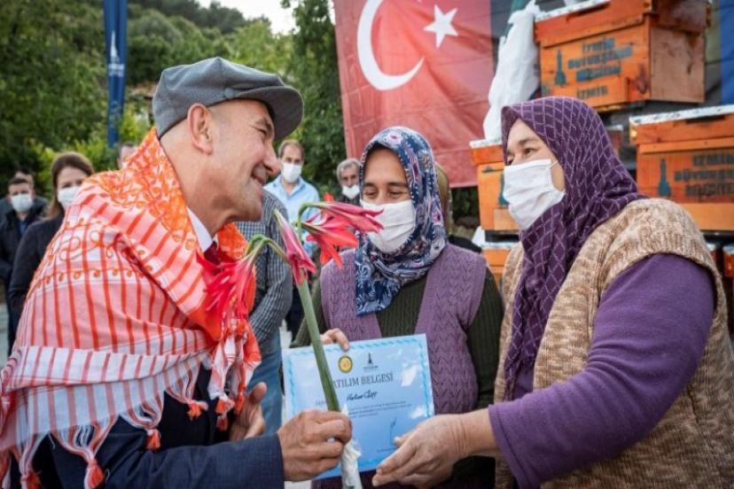 İzmir’de Karşıyaka Belediyesi’nin açtığı kursa katılarak eğimlerini tamamlayan ve arıcılık yapmaya başlayacak Sancaklı Köyü’ndeki 30 üretici,sertifikalarını aldı. Üreticilere 120 arılı kovan, 60 arısız kovan ile arıcılık malzemesi veren Büyükşehir Belediye Başkanı Tunç Soyer, “Biz çiftçimizi üretemez hale getiren küresel şirketlerin ve bu anlayışa hizmet eden ithalatçı politikaların terk edilmesi gerektiğini söylüyoruz” dedi.