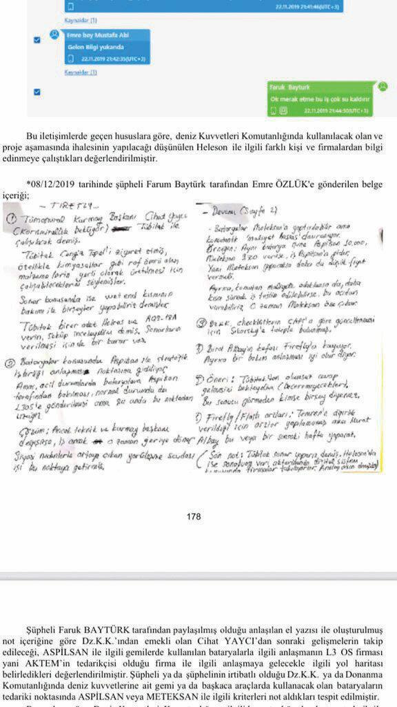 Sanık Faruk Baytürk el yazısı notlarında Meteksan’ın acil ihtiyaç konusu bataryaları üretebileceğini, ama deniz helikopterlerin füzelerden kaçabilmesini sağlayan “Firefly”ın yerli olarak üretilemeyeceği yorumunu yapıyor.