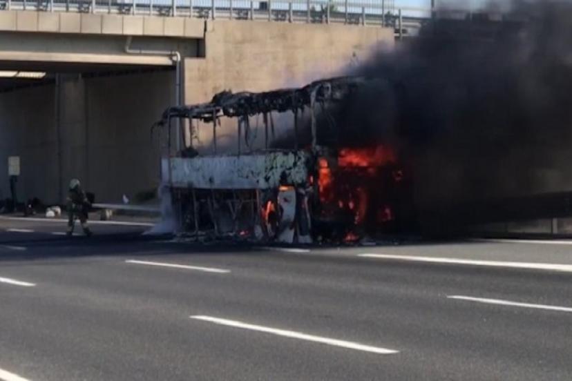 Çekmeköy Kuzey Marmara Otoyolu'nda yolcu otobüsünde yangın çıktı. Yolcuların tahliye edildiği otobüsü tamamen yandı.