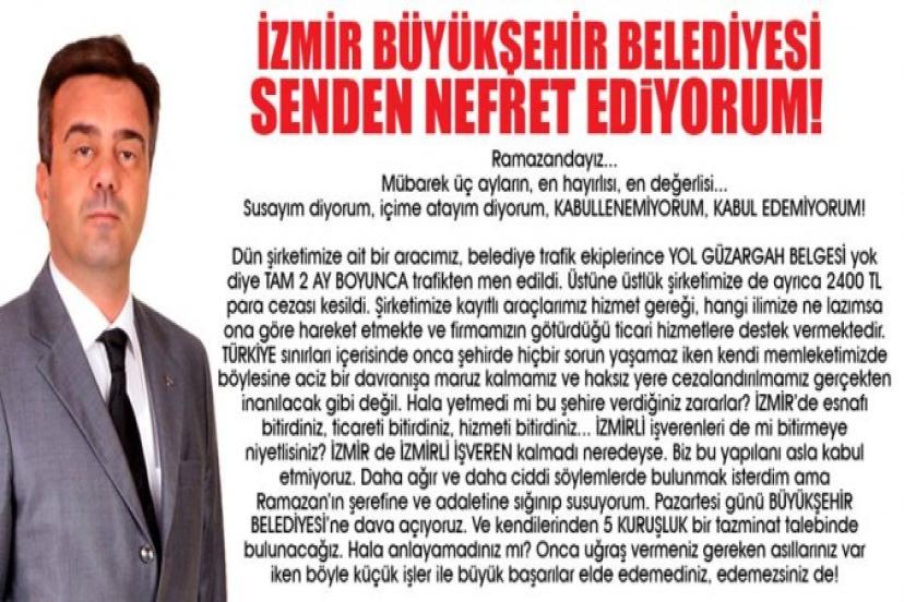 MHP’li iş adamı Adil Özyiğit, haksız uygulamaya isyan etti. Özyiğit, “Türkiye’nin hiçbir bölgesinde sorun yaşamazken neden İzmir’de bu sorunu yaşıyorum. Şirketimize ait araç trafikten men ediliyor. Haksız yere cezalandırılmamız inanılacak gibi değil. CHP’li İzmir Büyükşehir Belediyesine 5 kuruşluk dava açacağım. İzmir Büyükşehir Belediyesi senden Nefret ediyorum” dedi.