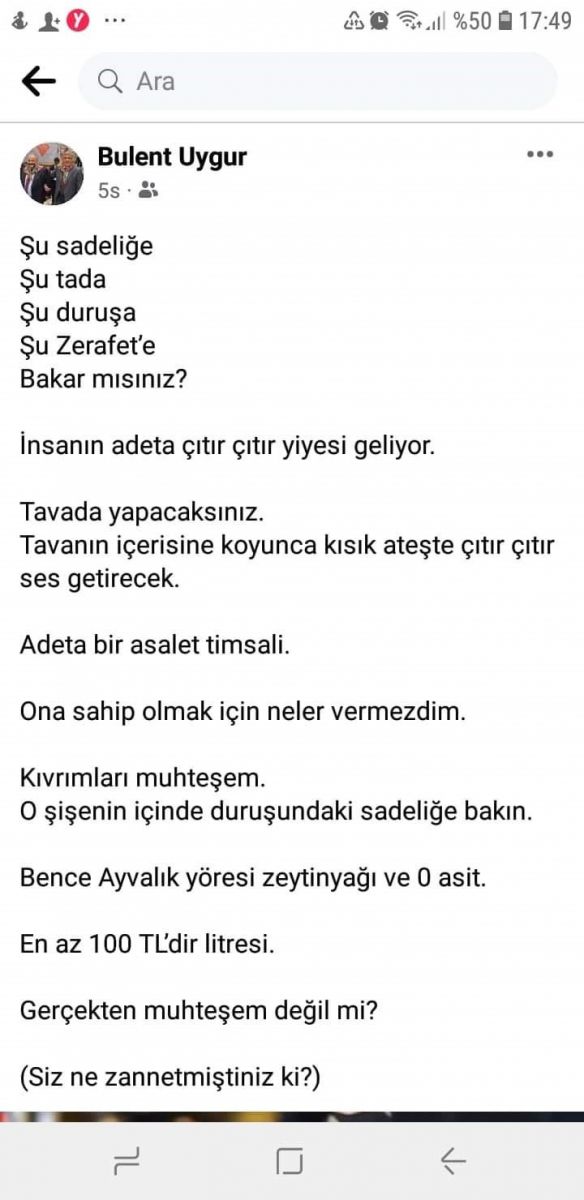 CHP’li Buca Belediye Meclis Üyesi Bülent Uygur’un kadın bedeni üzerinden zeytin yağ ile ilgili sosyal medya paylaşımına AK Parti’den tepki geldi. Geçtiğimiz aylarda, CHP’li Tire İlçe Başkanı Hakan Şenoyar’ın da kadın bedeni üzerinden yaptığı paylaşıma, AK Parti cephesinden gelen tepkiler sonrası, CHP İl Başkanlığı, İlçe Başkanı ve yönetimini görevden almak zorunda kalmıştı.