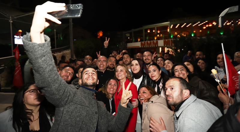 Uğur Mumcu Parkı'na gelinmesinin ardından siyasiler seçim otobüsünün üzerine çıkarak kalabalığa hitap etti. Alkışlar ve tezahüratlar eşliğinde konuşmasına başlayan Mutlu, "Bugün, tam 109 yıl önce bizim için hayatını veren şehitlerimizi anmak için bir araya geldik. Gencecik yaşta çocuklar o sene mezun olamadı. Bu vatan için canlarını feda ettiler. Bizler bu vatan için mücadele etmeye devam ediyoruz. Bu mücadelemizi önümüzdeki 5 yılda yerel yönetimlerde, 5 yıl sonra da iktidar olarak sürdüreceğiz. Partimiz İzmir'de bir tarih yazdı ve seçilebilecek yerlerden 9 kadın aday gösterdi. Bizler liyakatimiz, geçmişimiz ve çok çalışmamız sayesinde geldik. Bundan sonra da dayanışarak çok başarılı olacağız. Bu vatan için kendini feda edenlerin izinde, İzmir'e, Konak'a ve Karabağlar'a sahip çıkmaya sizlerin oylarıyla devam edeceğiz" ifadelerini kullandı. Miting havasında gerçekleşen konuşmaların ardından Mutlu, kendisine yoğun ilgi gösteren partililer ve vatandaşlarla bol bol fotoğraf çektirdi.