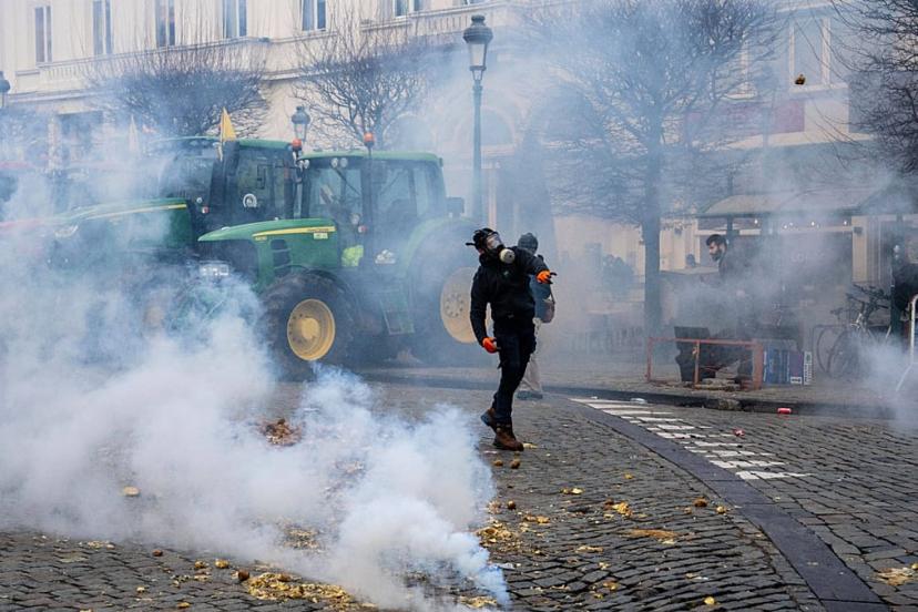 Tansiyon, Avrupa Parlamentosu yakınındaki Place du Luxembourg’da, bölgeyi güvenlik altına alan polisle karşı karşıya gelen birkaç yüz göstericiyle birlikte doruğa çıktı. Polis, göz yaşartıcı gaz ve tazyikli suyla karşılık verirken, traktörler yakındaki sokaklarda ilerledi ve göstericiler üzerinde "tarım" yazan derme çatma tabutları ateşe verdi.