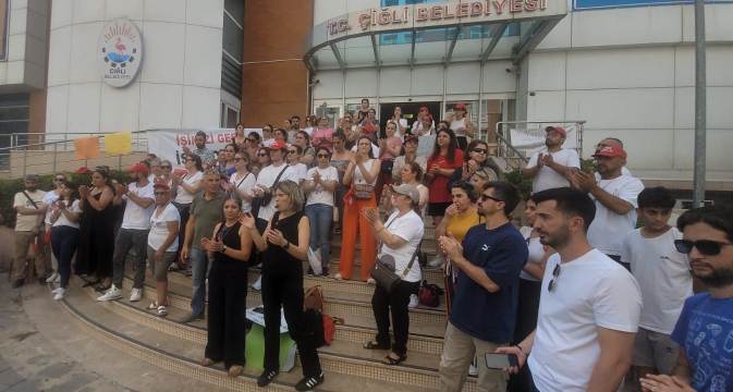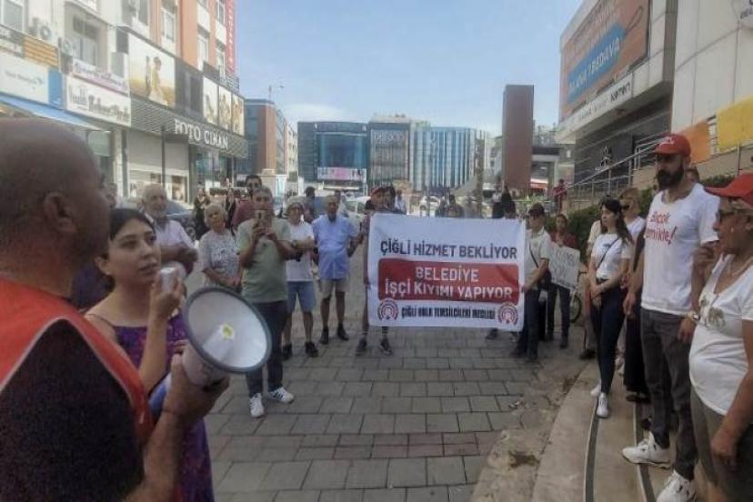 Çiğli Halk Temsilcileri Meclisi işleten atılan işçilerle dayanışma için bugün belediye önündeydi.