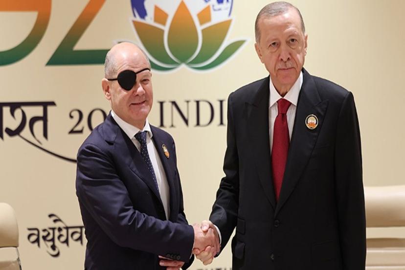 Cumhurbaşkanı Recep Tayyip Erdoğan, Yeni Delhi'de Almanya Başbakanı Olaf Scholz'u kabul etti. Erdoğan, kısa süre önce geçirdiği kaza nedeniyle "korsan bandı" olarak bilinen siyah göz bandı takan Scholz'e geçmiş olsun dileklerini iletti.
