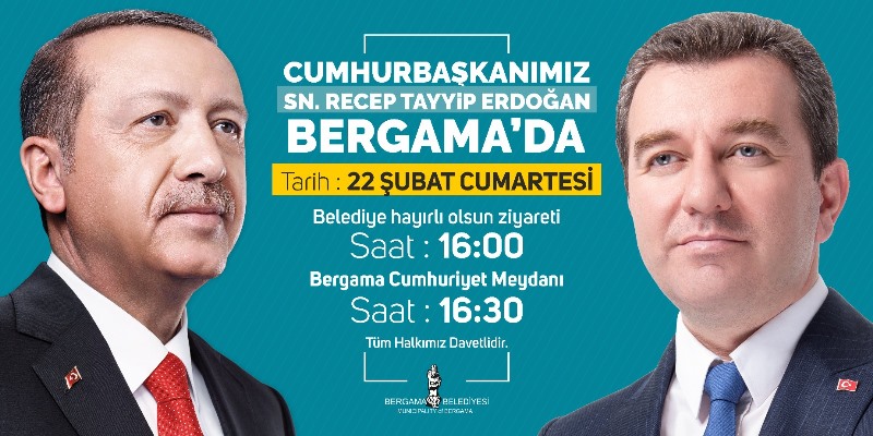 22 Şubat Cumartesi günü İzmir’de Kuzey Ege Otoyolu açılışını yapacak olan Cumhurbaşkanı Recep Tayyip Erdoğan daha sonra Bergama’ya gelecek. Bergama programı ile ilgili açıklama yapan Belediye Başkanı Hakan Koştu, “Dünya liderimiz, Cumhurbaşkanımız Sayın Recep Tayyip Erdoğan’ı Bergama’da ağırlamak için hazırlıklarımız devam ediyor. Tarihi kentimiz Bergama heyecanla Cumhurbaşkanımızın gelişini bekliyor” dedi.