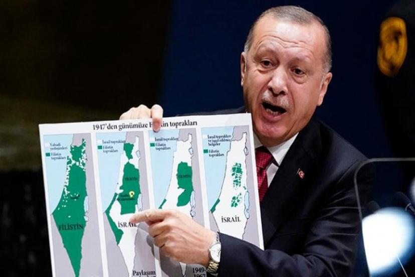 Erdoğan BM'de yaptığı konuşmada; Sokaktaki masum Filistinli kadının İsrail güvenlik güçleri tarafından alçakça öldürülmesi görüntüleri vicdanları harekete geçiremiyorsa artık sözün bittiği yerdir. Merak ediyorum, bu İsrail neresidir? Bu İsrail'in toprakları nereleri kapsıyor? 1947'de İsrail neresiydi, bunun ardından 1949-1967'de İsrail neresiydi ve şu anda İsrail neresi? Sene 1947 neredeyse burada İsrail yoktu. Sene 1947 paylaşım planı vardı" diyerek İsrail'i sert bir şekilde eleştirdi.