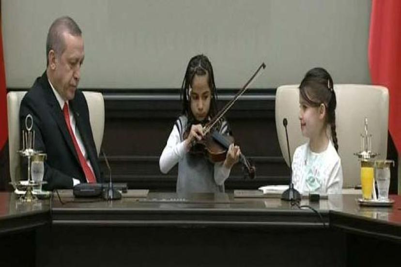 Çocuklara Milli Eğitim Bakanı Nabi Avcı eşlik etti. Saray'a gelenler arasında bulunan bir kız öğrenci kemanla Çanakkale Türküsü'nü çaldı. Erdoğan'ın da bu sırada mırıldanarak şarkıya türkiye eşlik ettiği görüldü. Küçük kız daha sonra Erdoğan'ın vefat eden annesi içinde 'Güzel annem' şarkısını çaldı. Küçük kızın "Cumhurbaşkanım bu parça da sizin anneniz için" demesi üzerine Cumhurbaşkanı Erdoğan, "Off şimdi beni yıktın" dedi.Erdoğan küçük kızdan açılacak konser salonunda resital vermesini istedi...