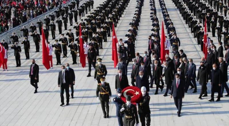 Cumhurbaşkanı Erdoğan, Atatürk'ün mozolesine çelenk bıraktı, ardından saygı duruşunda bulunuldu ve İstiklal Marşı okundu.