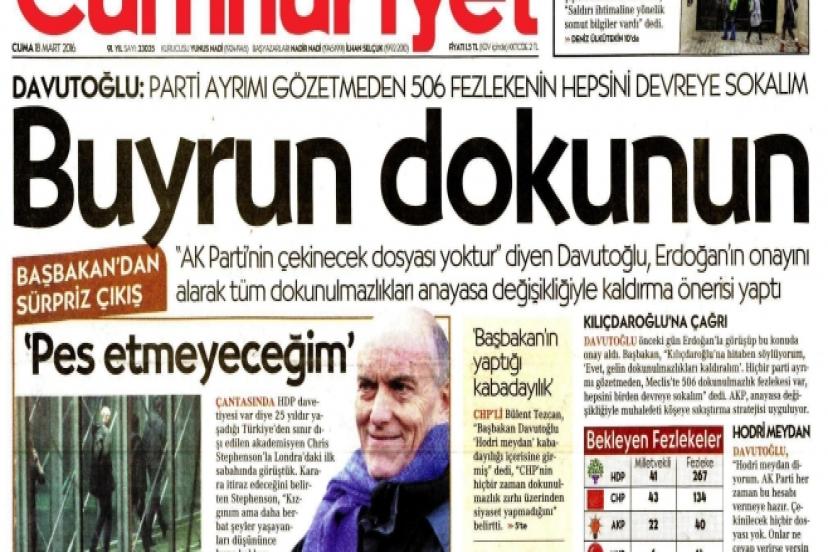 Cumhuriyet gazetesi yönelik operasyonda Genel Yayın Yönetmeni Murat Sabuncu, avukat Bülent Utku, yazarlar Hikmet Çetinkaya, Aydın Engin, Güray Öz ve Mustafa Kemal Güngör'ün de aralarında bulunduğu 9 kişi gözaltına aldı. Aydın Engin ve Hikmet Çetinkaya, Haseki Eğitim ve Araştırma Hastanesinde sağlık kontrolünden geçirildi. Ankara'da gözaltına alınan Güray Öz'ün İstanbul'a getirileceği öğrenildi.