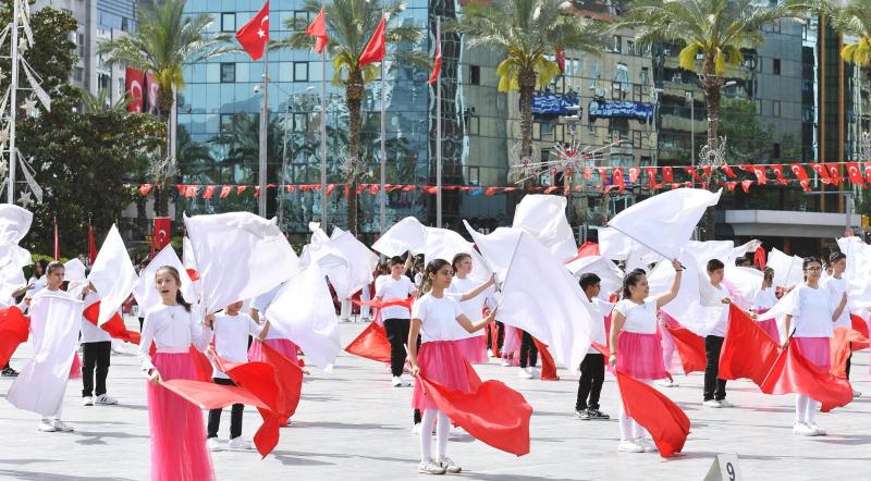 Cumhuriyet Meydanı'nda düzenlenen tören, renkli görüntülere sahne oldu. Törende İzmirlilerle bayramlaşan Başkan Dr. Cemil Tugay, çocuklar ve aileleriyle hatıra fotoğrafı çektirdi. Cumhuriyet Meydanı'ndaki törende ilk ve orta öğretim öğrencilerinin renkli gösterileri büyük ilgi gördü. Miniklerin günün anlam ve önemine ilişkin şiirleri, dans gösterileri ve halk dansları izleyenleri büyüledi.