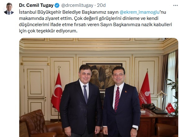 CHP’de düzenlenecek kurultayda Özgür Özel’i destekleyecek olan Karşıyaka Belediye Başkanı Cemil Tugay yaptığı paylaşımda: “İstanbul Büyükşehir Belediye Başkanımız sayın @ekremimamoglu’nu makamında ziyaret ettim. Çok değerli görüşlerini dinleme ve kendi düşüncelerimi ifade etme fırsatı veren Sayın Başkanımıza nazik kabulleri için çok teşekkür ediyorum” dedi.