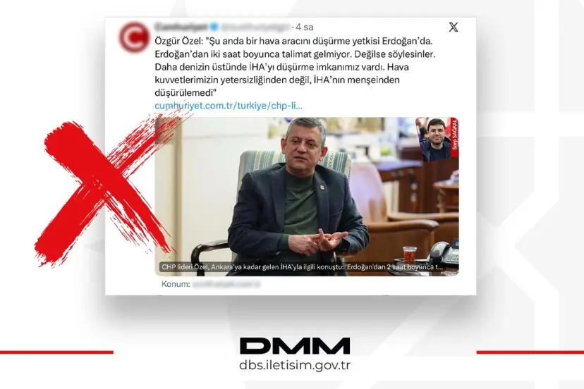 Dezenformasyonla Mücadele Merkezi, 15 Aralık’ta Karadeniz yönünden hava sahamıza yaklaşan bir insansız hava aracının (İHA) düşürülmesine ilişkin bazı basın yayın organlarında yer alan “Cumhurbaşkanlığı talimatıyla düşürüldü” iddialarını yalanladı.