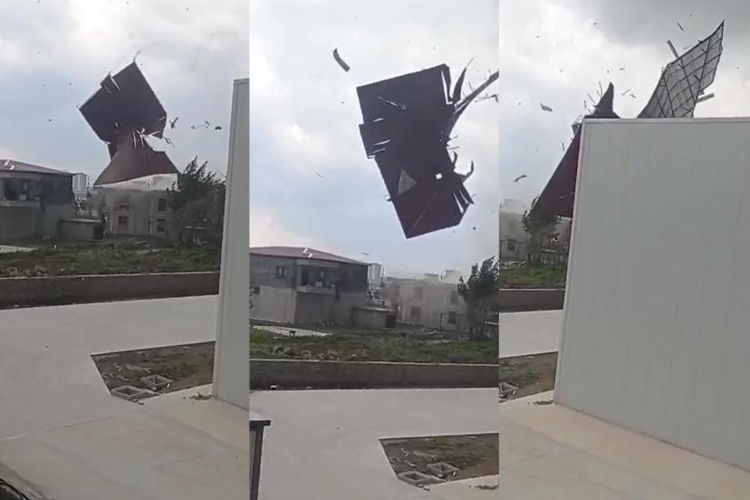 Görüntülerde, hortumun etkisiyle büyük parçaların metrelerce yükseğe savrulduğu ve çevreye saçıldığı görülüyor. Özellikle bir yapıya ait çatı bölümünün tamamen koparak havada sürüklendiği anlar dikkat çekti.