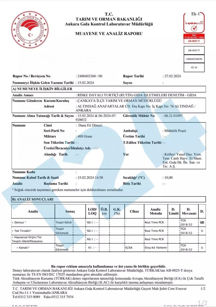 Tarım Ve Orman Bakanlığı'nın yaptığı denetimlerin ardından Köfteci Yusuf'tan alınan numunelerde domuz eti tespit edildi. 27 Şubat ve 7 Mart tarihlerinde sonuçlanan iki farklı muayene ve analiz raporunda, numune olarak alınan dana eti döneri ve tüketime hazır pişmiş köftede domuz etine rastlandı. Yapılan incelemelerde, tek tırnaklı ya da kanatlı hayvan eti ise tespit edilemedi. İncelemeler pişmiş köfte eti ve dana eti dönerinden numune alınarak yapıldı. Pişmiş köfte etinden 300 gram, dana eti dönerinden 400 gram numune alındı. Raporlara göre her iki üründe domuz eti tespit edildi.