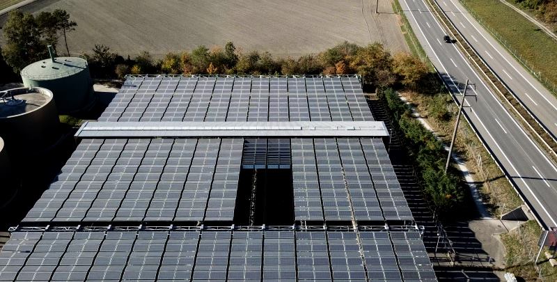 Almanya’nı en ünlü su yollarından biri olan Ren Nehri ile Plessur Çayı’nın birleştiği yerde; İsviçre’nin Chur kentinde yer alan atık su tesisinde 5,800 m²’lik alan tesisinin katlanabilir güneş panel çatısı, ön arıtma, ikinci (biyolojik) arıtma ve üçüncü arıtma havuzunu kapatmaktadır.