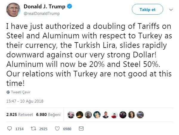 "Şu anda Türkiye’nin çelik ve alüminyum ithalatına uygulanan ek gümrük vergisini iki katına çıkarmaları yetkisi verdim. TL güçlü dolarımıza karşı çok hızlı bir şekilde aşağı gidiyor. Alüminyum vergisi %20, çelik % 50 olacak. Türkiye ile ilişkilerimiz şu an iyi değil”
