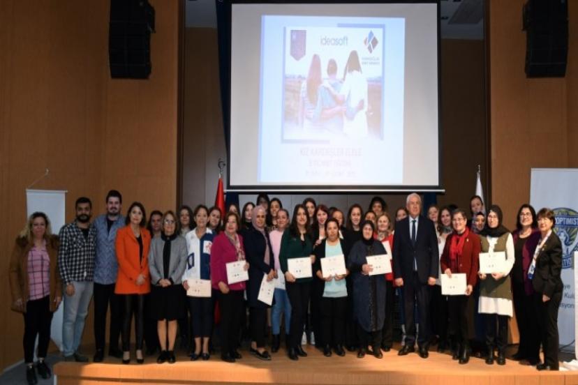 Karabağlar Kent Konseyi ve İzmir Soroptimist Kulübü işbirliğiyle yürütülen “Kız Kardeşler El Ele” programının 2. aşamasına katılan 36 kadın, 25 Ekim-29 Kasım 2022 tarihleri arasında “e-ticaret” konusunda kapsamlı bir eğitim aldı. Kadınlara sertifikalarını Mobilya Akademi’de düzenlenen törenle Karabağlar Belediye Başkanı Muhittin Selvitopu verdi.