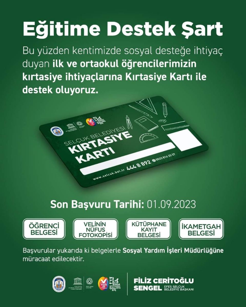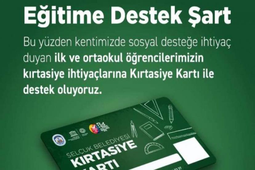 Efes Selçuk Belediyesi tarafından sağlanacak Kırtasiye Kartı desteğinden yararlanmak isteyen ilk ve ortaokul öğrencileri için son başvuru tarihi 1 Eylül.