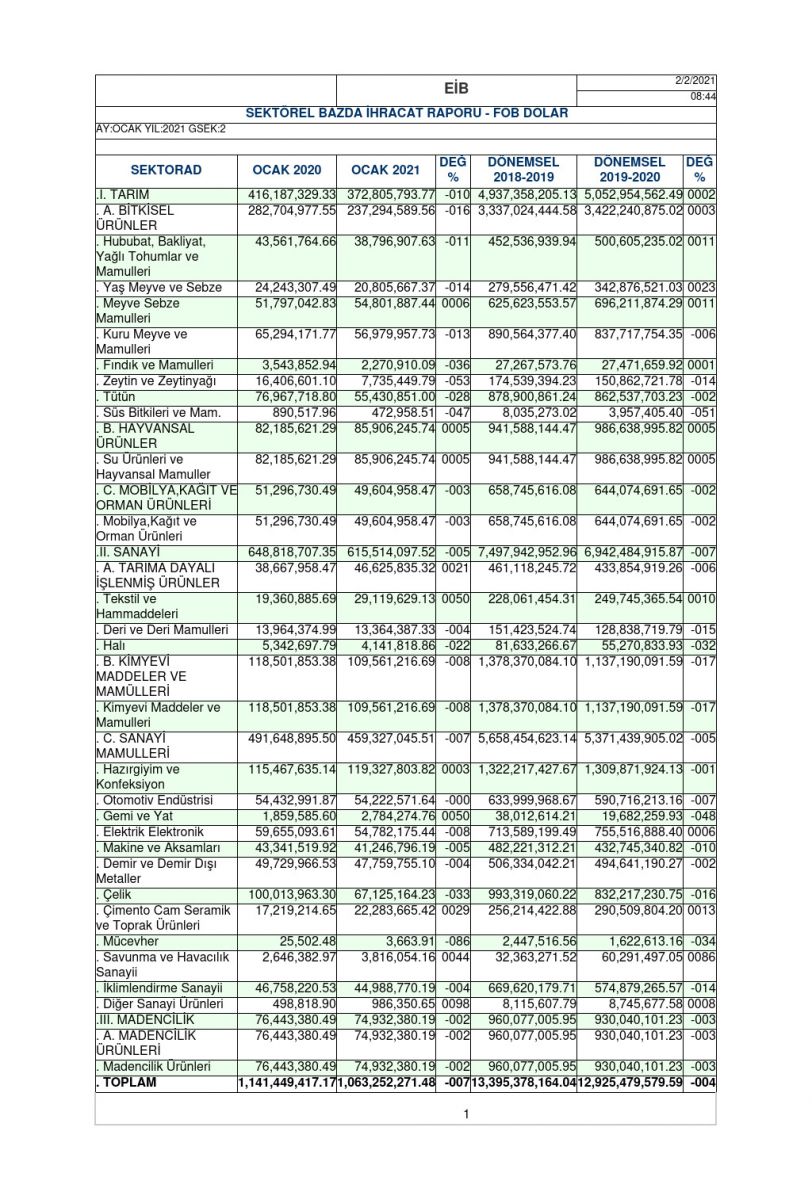 Ocak ayında Türkiye ihracatı yüzde 2,5’luk artış gösterirken, EİB'nin ihracatı 2021 yılı Ocak ayında yüzde 7 azaldı. Ege İhracatçı Birlikleri'nin 2020 yılı Ocak ayındaki ihracatı 1 milyar 141 milyon dolar olmuştu.