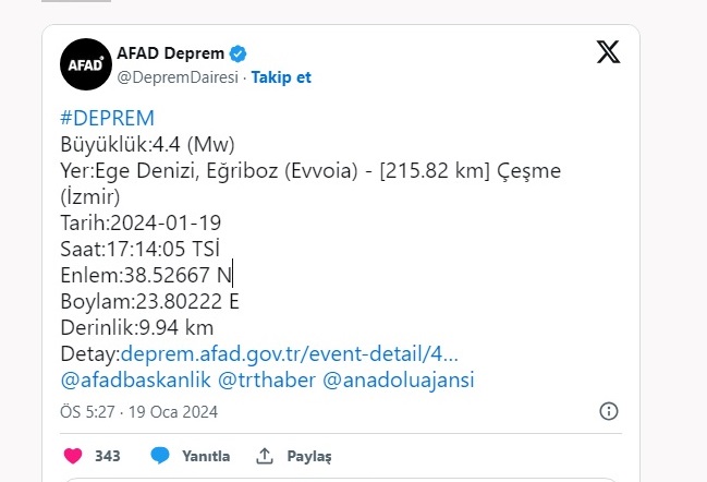 AFAD, Ege Denizi'nde 4,4 büyüklüğünde deprem meydana geldiğini duyurdu.