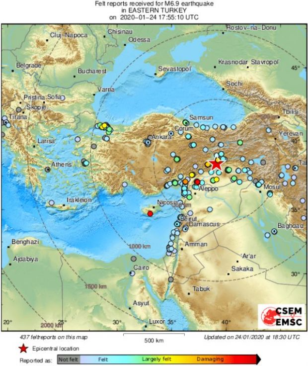 Avrupa-Akdeniz Sismoloji Merkezi, Elazığ'daki 6,8 şiddetindeki depremin Irak, Suriye, İran, Ermenistan, Lübnan ve İsrail'de de hissedildiğini açıkladı.