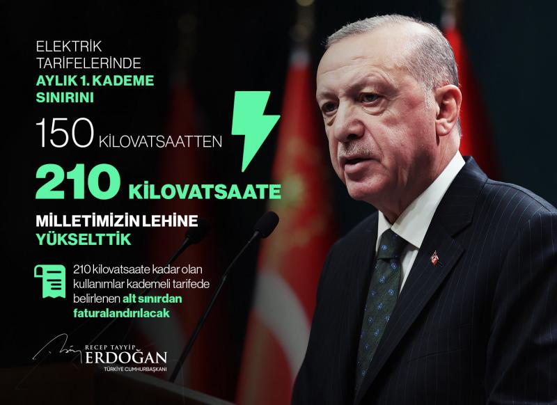 Vatandaşlarımızın elektrik faturalarının 2 kat, hatta 3 kat arttığı yönündeki şikayetleri üzerine ilgili kurumlarımıza elektrik tarifelerinin yeniden düzenlenmesi talimatını verdim. Bu çerçevede en düşük tarifede günlük 5 kilovat olarak hesaplanan tüketim tutarını 7 kilovata, dolayısıyla aylık tüketimi de 150 kilovattan 210 kilovata çıkartıyoruz. Şubat ayında sarf edilecek elektriğin faturası, vatandaşlarımızın lehine yapılacak bu yeni düzenlemeye uygun şekilde gelecektir.