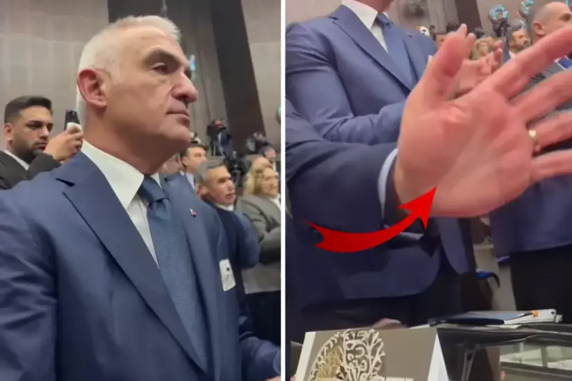 Bakan Ersoy'un soruyu duymazdan geldiği ve kameraya bakmayarak alkışını sürdürdüğü anlar dikkat çekerken yanındaki bir kişi ise eliyle kameranın görüntü almasını engellemeye çalıştı.