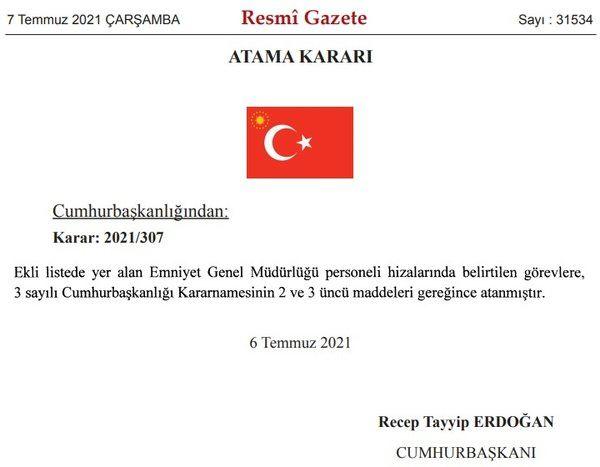 Cumhurbaşkanı Recep Tayyip Erdoğan'ın imzasıyla, Emniyet Müdürleri Atama Kararnamesi Resmi Gazete'de yayımlandı.
