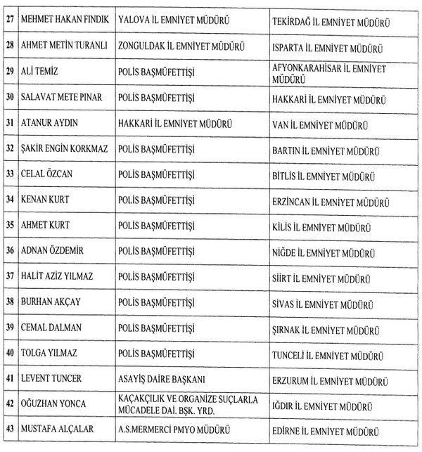 Diyarbakır Emniyet Müdürü Şükrü Yaman, Avusturya Viyana İçişleri Müşaviri olarak atandı. İzmir Emniyet Müdürü Hüseyin Aşkın ise Diyarbakır Emniyet Müdürlüğüne getirildi. Aşkın'dan boşalan koltuğa ise Mersin Emniyet Müdürü Mehmet Şahne geldi. Eski İstihbarat Daire Başkanlığı görevini yürüten Eskişehir Emniyet Müdürü Engin Dinç ise Konya Emniyet Müdürlüğüne atandı.