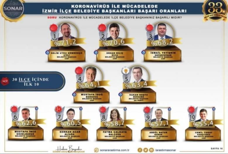 Ülke genelinde yaptığı önemli anketlerle tanınan SONAR’ın 1 Şubat - 15 Nisan tarihleri arasında, 20 büyükşehirin 8'inde yüz yüze, 12'sinde ise telefon yöntemiyle gerçekleştirdiği anket aynı zamanda ilçeleri de kapsıyor. İzmir'deki 30 ilçe sonuçlarının da yer aldığı ankette ilçeler bazında Koronavirüs ile mücadelede Bergama Belediye Başkanı Hakan Koştu, Çiğli, Buca, Seferihisar, Bornova’dan sonra yüzde 63,4 oy alarak 5’nci sırada yer aldı. Anket sonuçlarının değerlendirilmesinde Bergama Belediye Başkanı Hakan Koştu’nun İzmir'in büyük ilçeleri arasında 5’nci sırada yer alması dikkat çekici bir durum olarak değerlendirildi.