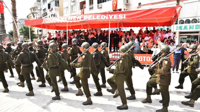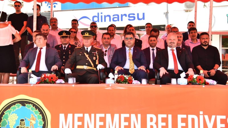 Protokolün Cumhuriyet Meydanı’ndaki Atatürk Anıtı’na çelenk sunmasının ardından saygı duruşu ve İstiklal Marşı okundu. Menemen Kaymakamlığı’nda tebriklerin kabulünün ardından Atatürk Caddesi’nde bando eşliğinde kutlama ve geçit töreni düzenlendi.