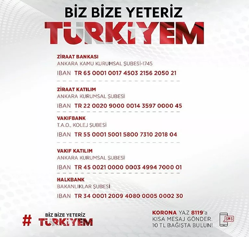 Erdoğan, "Biz Bize Yeteriz Türkiyem" diyerek başlatılan kampanya için Aile, Çalışma ve Sosyal Hizmetler Bakanlığınca yardım hesabı açıldığını bildirdi.