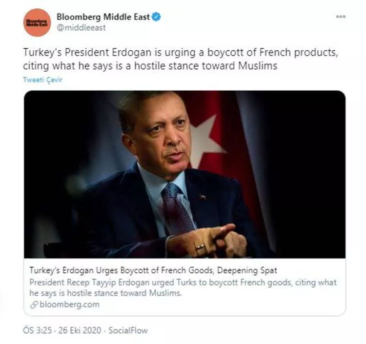 Bloomberg ise Erdoğan'ın çağrısını; "Türkiye Cumhurbaşkanı Erdoğan, Müslümanlara karşı düşmanca bir tutum olduğunu söyleyerek Fransız ürünlerini boykot etmeye çağırıyor" şeklinde duyurdu.