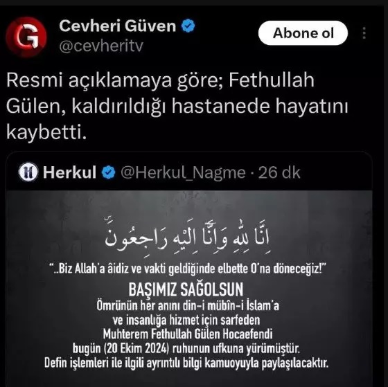 Bizzat FETÖ sözcülüğü yapan 'Herkülname' sitesinde "Fetullah Gülen ruhunun bugün (20 Ekim 2024) ufkuna yürümüştür" ifadelerine yer verildi.