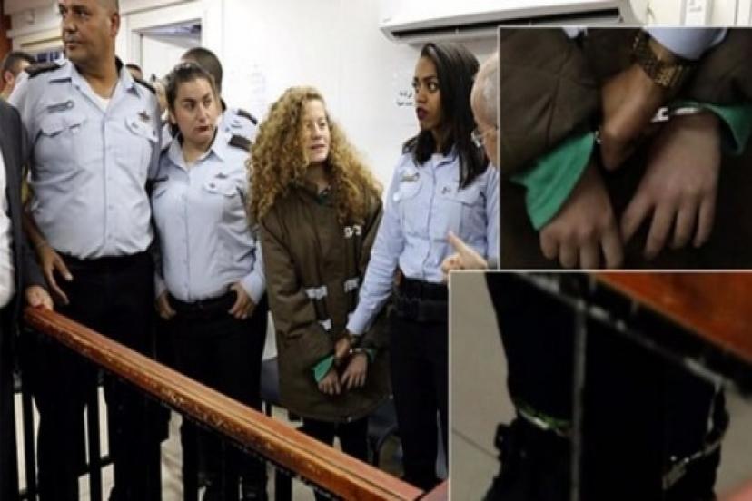 Filistinli cesur kız Ahed Temimi'nin gözaltı süresi 5 gün uzatılırken, İsrail polisi duruşmaya getirdiği 16 yaşındaki kızın ayaklarına zincir bağladı.