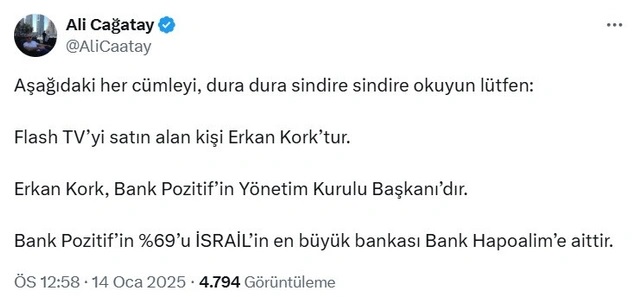 Flash Haber TV'nin yeni sahibi Erkan Kork oldu. Gazeteci Ali Çağatay'ın edindiği bilgiye göre, Erkan Kork aynı zamanda BankPozitif’in yönetim kurulu başkanı. BankPozitif’in yüzde 69’u ise İsrail'in en büyük bankası Bank Hapoalim’e ait.