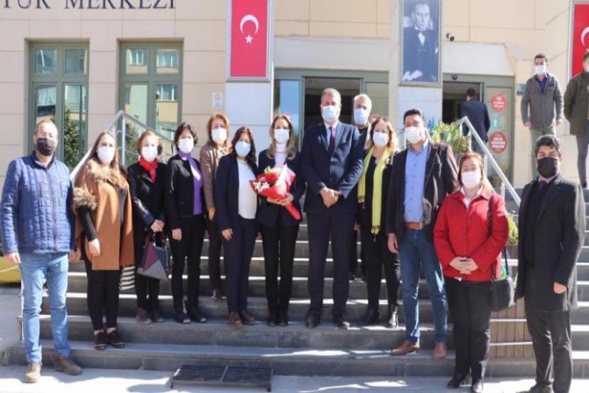 Cumhuriyet Halk Partisi Kadın Kolları Genel Başkanı Aylin Nazlıaka, Tire Belediye Başkanı Salih Atakan Duran'ı makamında ziyaret etti. Başkan Duran Genel Başkan Nazlıaka'yı eşi Necibe Duran ve CHP Tire Kadın Kolları Başkanı Zehra Dibekçi ile birlikte karşıladı.